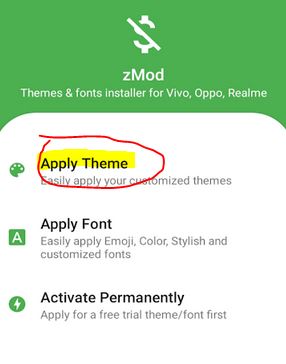 - Buka Aplikasi zMOD – Theme & Font Installer dan Pilih Apply Theme