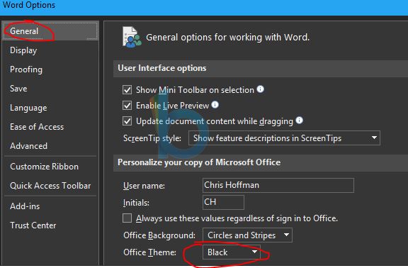 Pada tab General cari Office Theme dan pilih Opsi menjadi Black