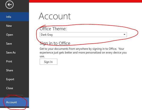 3. Pada Office Theme Pilih Dark Gray