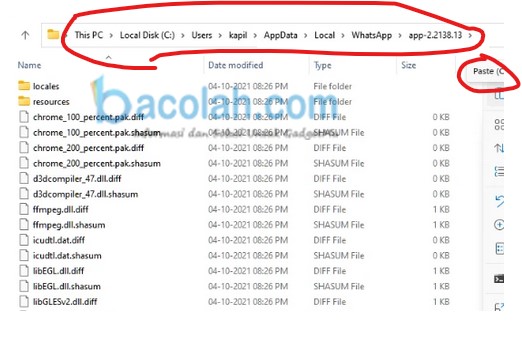 - Kemudian buka folder versi whatsapp yang terbaru app-2.2138.13 (versi baru) dan pastekan file nya disana. Timpa (replace) saja semua file tersebut.