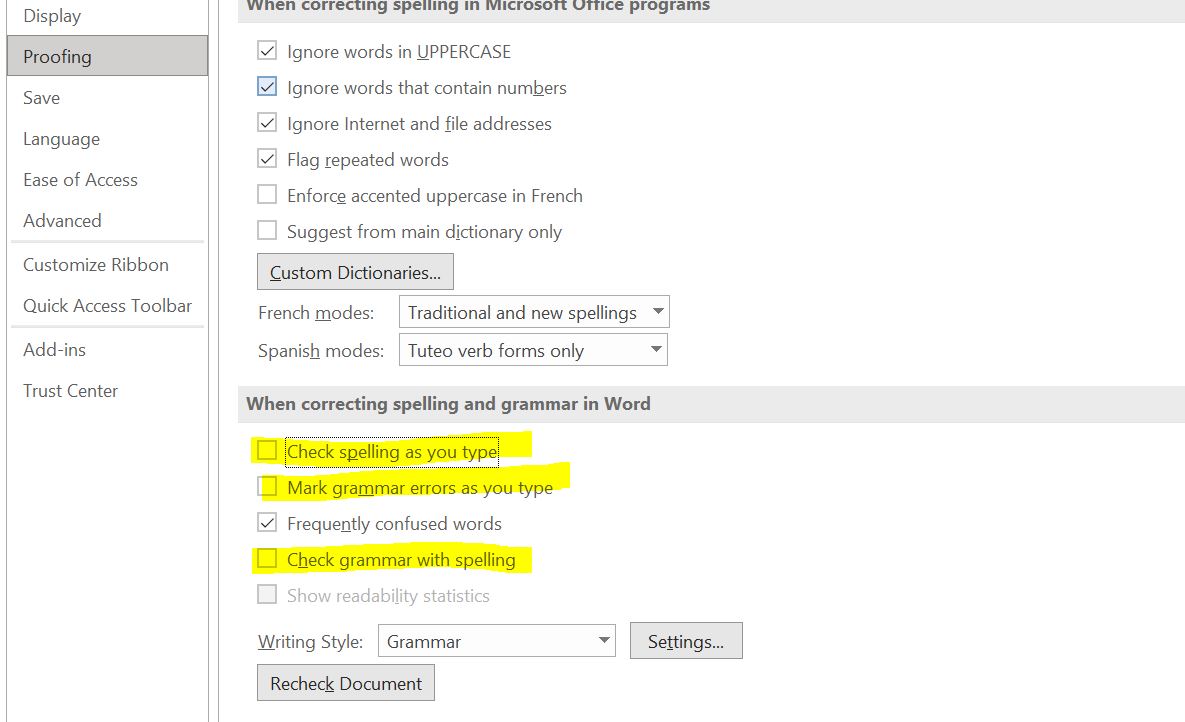 3. Klik tab Proofing > dan Hilangkan Ceklist Pada :