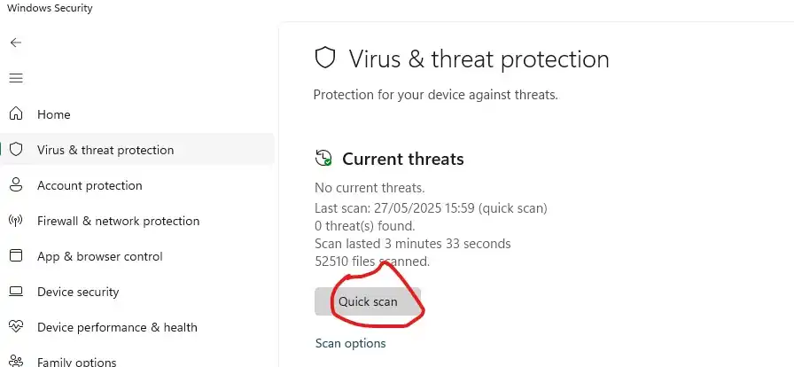 Solusi pertama yang bisa Anda lakukan adalah dengan melakukan scan dengan menggunakan antivirus bawaaan windows (Windows Security ) atau aplikasi antivirus pihak ketiga. Karena, bisa saja file acrodist.exe terkena virus.